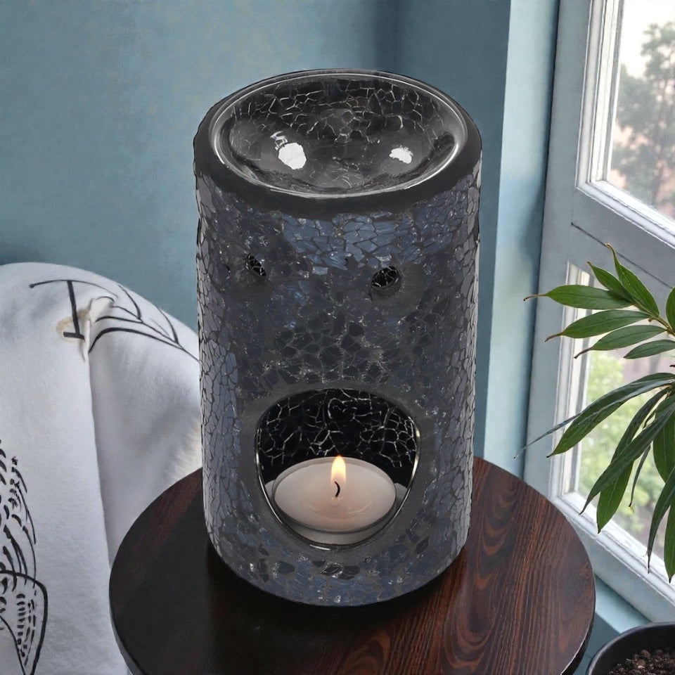 A pillar-shaped oil burner with a black mirrored crackle finish. A subtle statement piece for any home. Suitable for use with oils or wax melts; please be mindful of the bowl’s size and depth to avoid overflow when wax is melted.